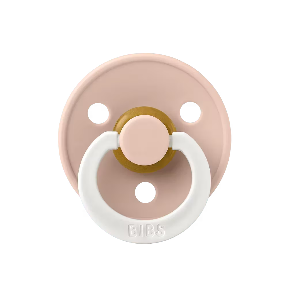 BIBS Colour pacifier is the original BIBS pacifier and has been on the market for over 40 years. It has the signature round BIBS shield with three vent holes and round BIBS engraved handle ring.