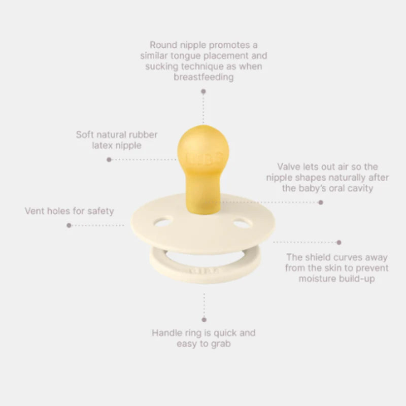 BIBS Colour pacifier is the original BIBS pacifier and has been on the market for over 40 years. It has the signature round BIBS shield with three vent holes and round BIBS engraved handle ring.