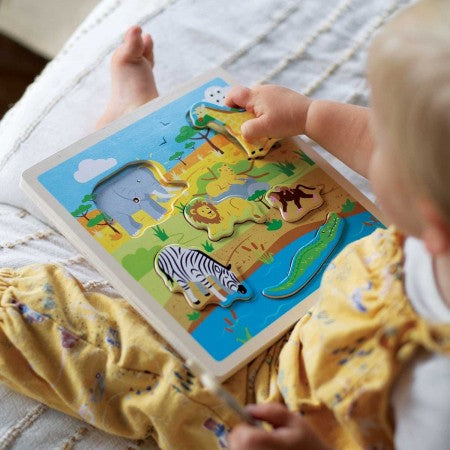 A Sound Puzzle that makes animal noises when little fingers place each puzzle piece into the correct slot. Sound puzzles are a fun way for children to learn about the different noises wild animals make. This vibrant wooden puzzle is perfectly sized for little hands to grasp, examine, and place and build their general animal knowledge.
