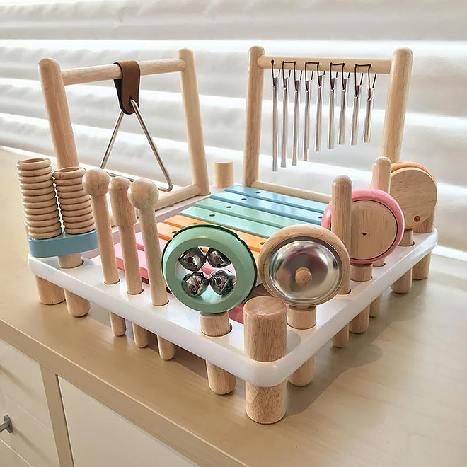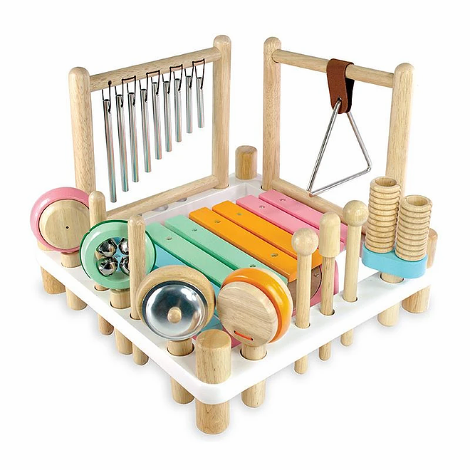 Your budding musician will be able to bang the drum, strike the chimes or play a tune on the xylophone. Children can click the castanet, and experiment with the triangle, cymbal, bells, maracas, or double guiro. The melody mix also comes with two strikers, a scraper and a set of rhythm sticks, so your little one will have plenty to discover and explore!