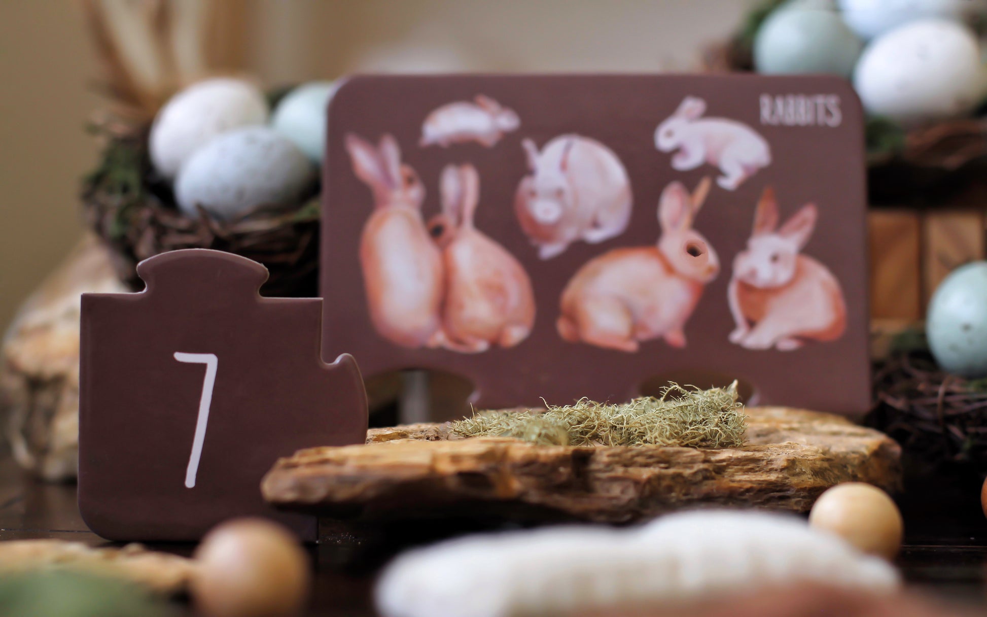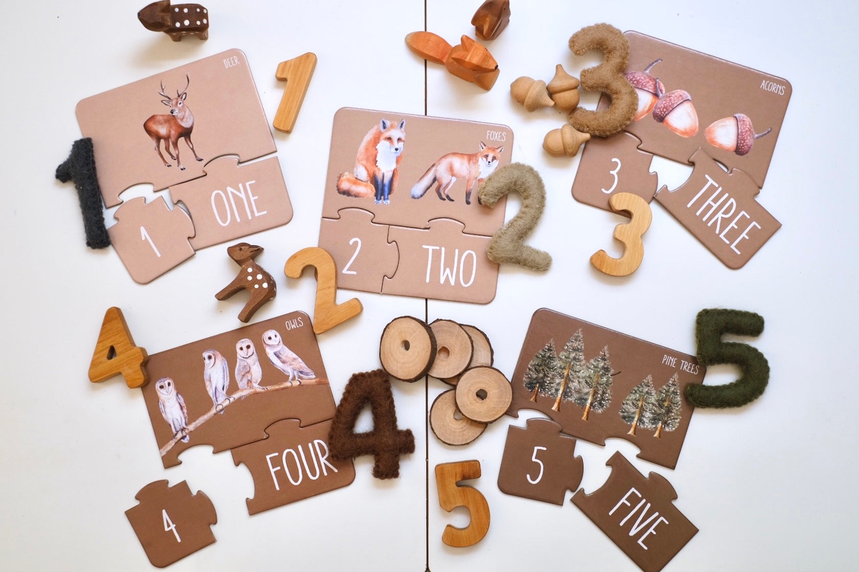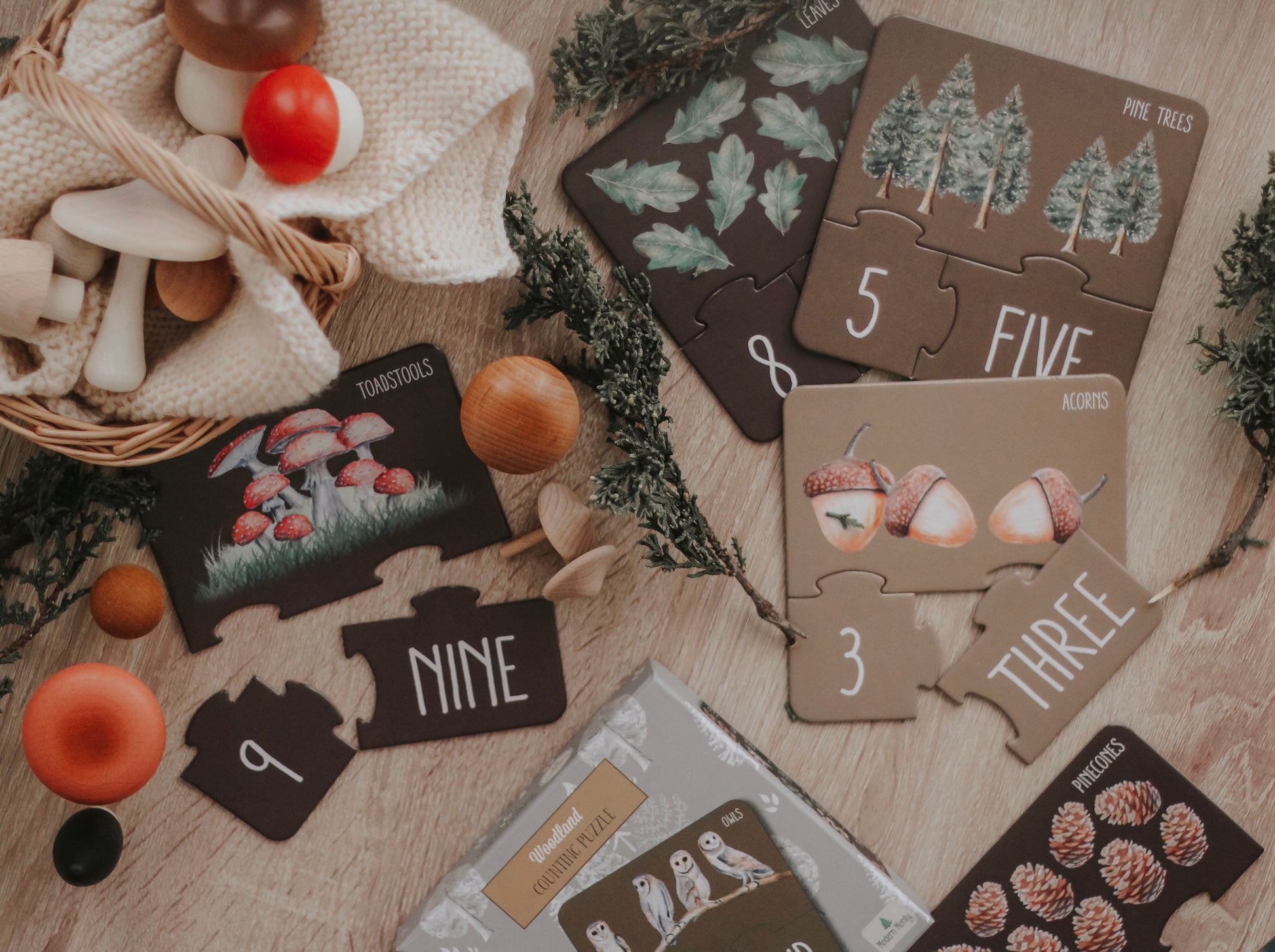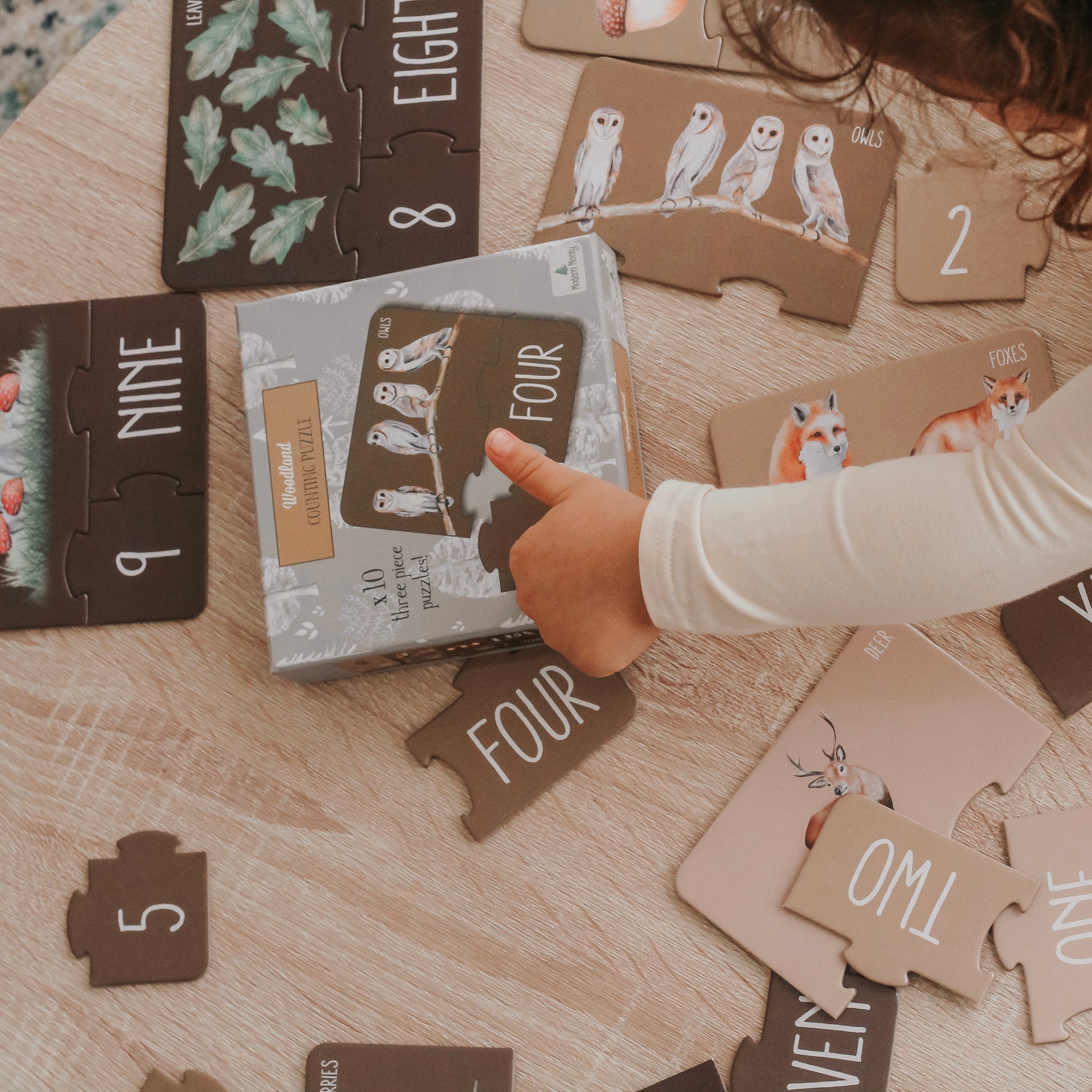 Woodland Counting Puzzle includes 10 x 3 piece puzzles packaged in a beautiful box. The puzzle pieces themselves are made of recycled materials and are premium quality for durability and longevity.