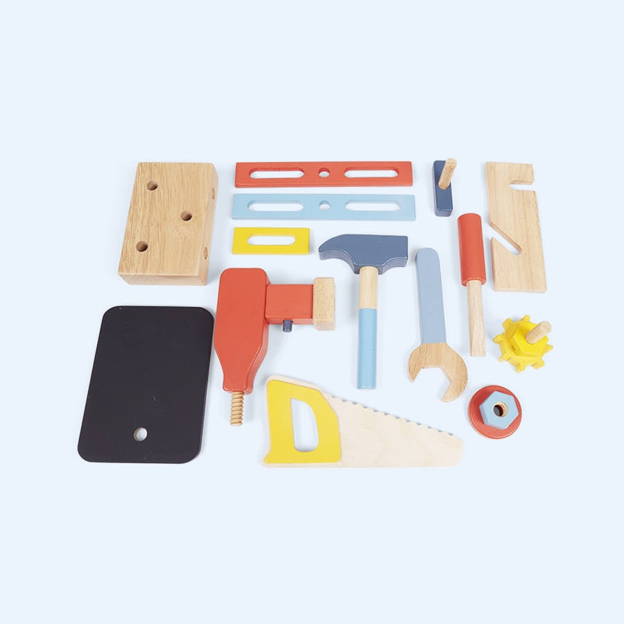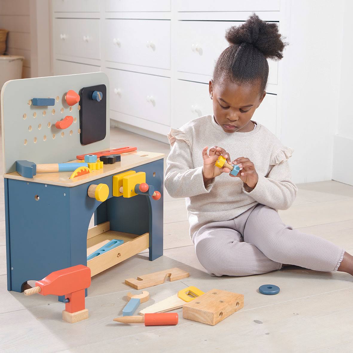 Creative play is the theme here with lots of holes in which to either place your tools or make a face or even a robot! Tools included are a Hammer, Screwdriver, spanner, saw and handy red drill. Chalk up a design on the blackboard! Dimensions16.54 x 10.16 x 19.29 CompositionRubberwood and 100% Wooden Tools Tender leaf toys creates gentle, beautifully designed toys that promote learning through play. Their Toys traditional in concept but contemporary in design and all their products are made with a distinct focus on craftsmanship and quality. Designed in the UK, all of their products start with original sketches before they are sampled and then coloured and finally tested. With their unique blend of soft cotton fabric, gentle non toxic water stain combined with sustainable rubber wood / high quality plywood, Tender Leaf Toys make the perfect gift and look stylish around the modern playroom or nursery. They place a strong focus on child development - physical, social, creative and imaginative play are integral to all their products. Their manufacturing processes, starting from cutting, painting and drying of the wood, are all undertaken at the same factory location in Indonesia. They have been awarded the ICTI seal of approval and strive to maintain ethically high standards throughout their organization. They care about children's future and the future of our planet - all their toys are made from sustainable rubberwood and for every tree that becomes a beautiful toy, another is replanted. All of their toy products meet the European and American standard safety of toys according to EN71, CPSC and ASTM.
